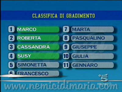 Classifica di gradimento in arrivo con un paio di giorni di ritardo ad Amici di Maria, visto che domenica in diretta non l’hanno fatta vedere, fregandosene altamente di chi da casa spende un euro per votare il proprio beniamino.
