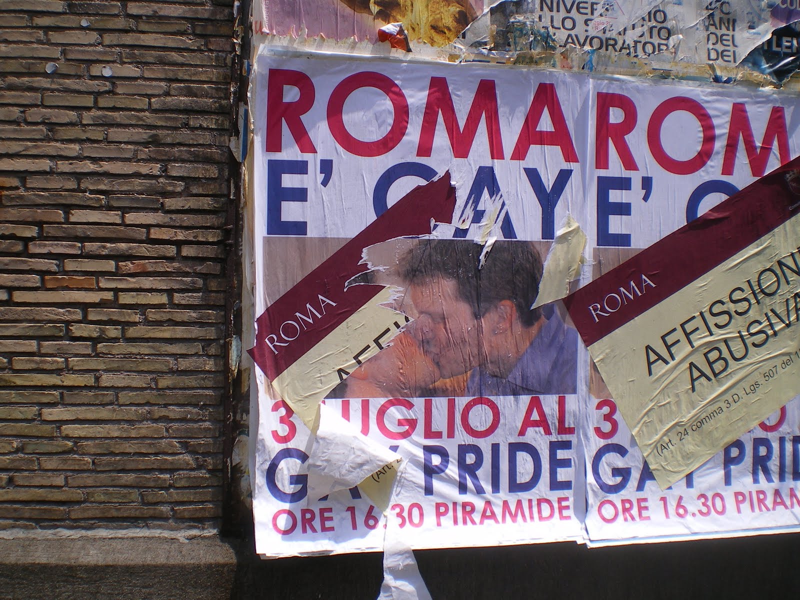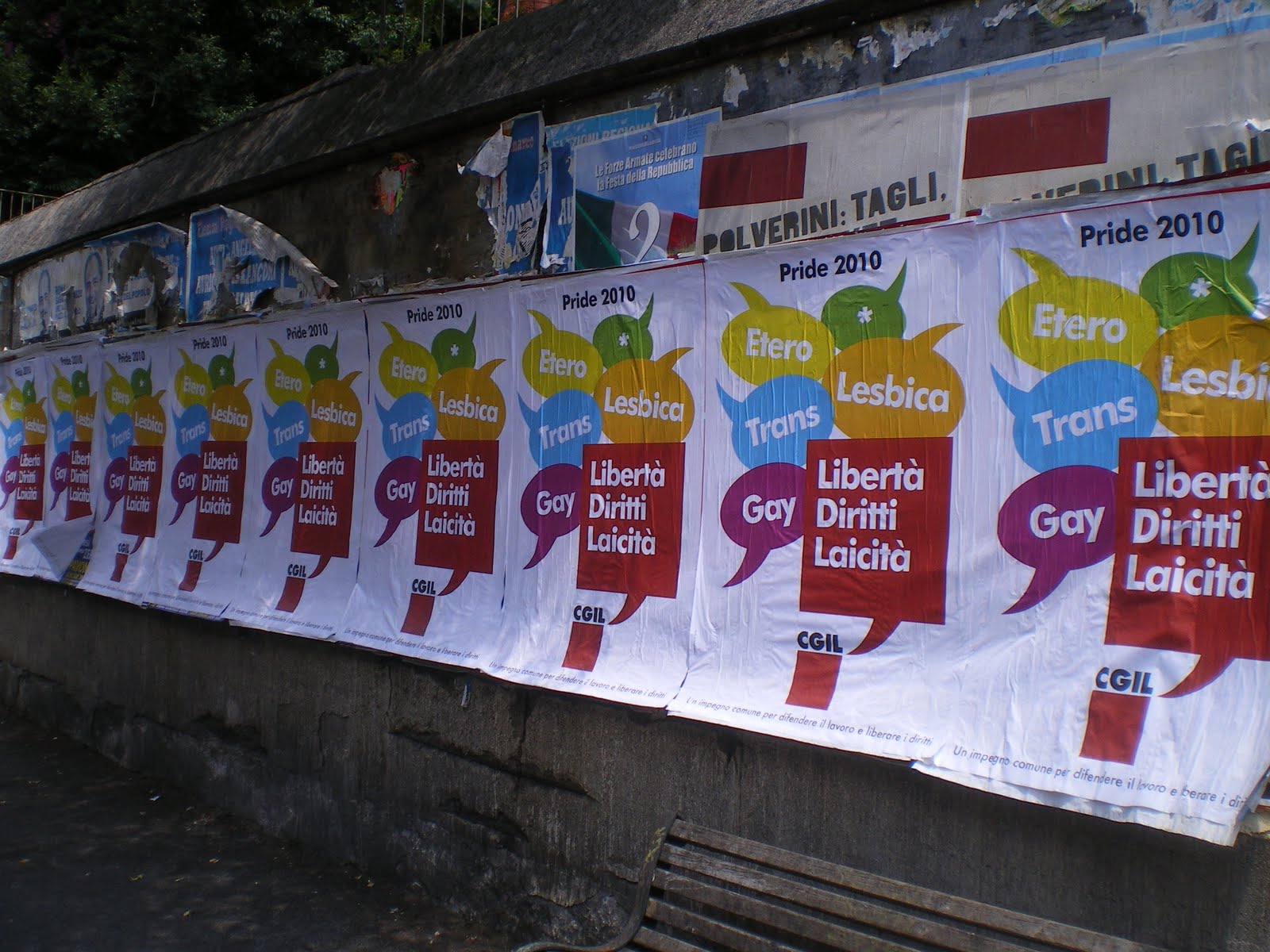 Peccato che l’intera via sia TAPPEZZATA di manifesti (come potete vedere dalle foto scattate dal sottoscritto). Ma solo questi vengono dichiarati ABUSIVI. E dove viene piazzato il MARCHIO CENSOREO? Proprio sull’immagine del bacio gay. Ma la cosa DAVVERO incredibile, e che ti porta automaticamente a PENSAR MALE, è che pochi metri prima c’è un altro manifesto del Pride 2010, della CGIL.